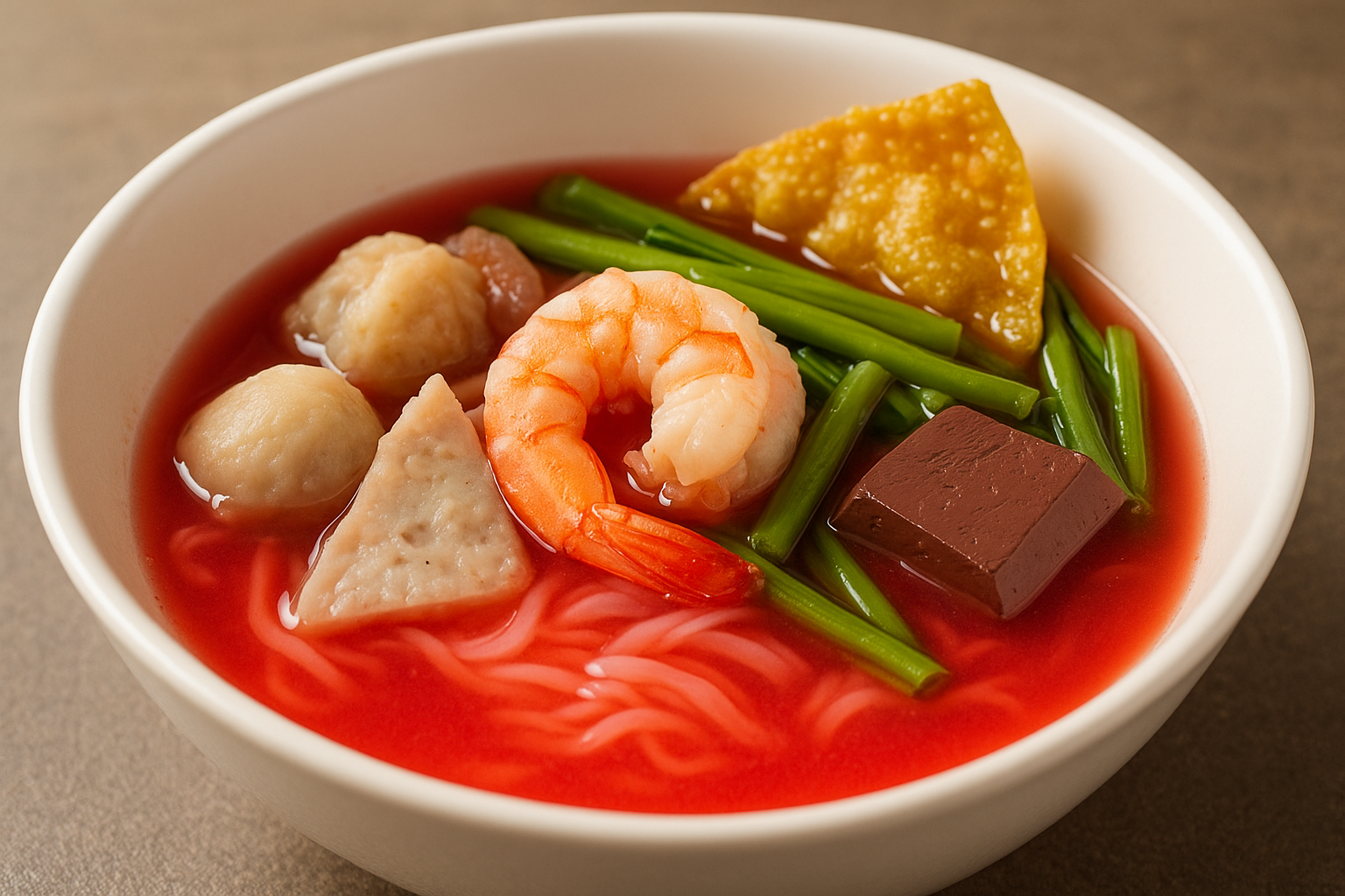 - 다양한 고명: 어묵, 튀긴 완탄, 공심채 등 푸짐한 재료들이 조화를 이룹니다.